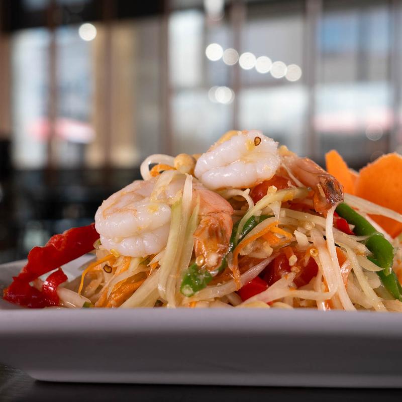 Raw green papaya, green bean, tomatoes, dried shrimp and roasted peanuts.